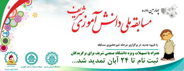 شرکت در این مسابقه خواهشمندیم حداکثر تا پایان روز جمعه 24 آبان ماه جهت ثبت نام و تکمیل ثبت نام خود اقدام فرمایند.»